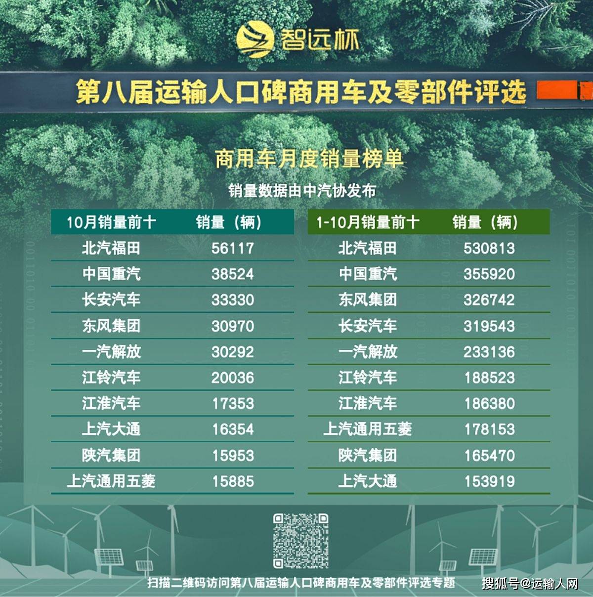 从1至10月的累计销量来看,商用车市场总销量达到347.9万辆,同比增长9%。其中,福田汽车累计销售53.08万辆,继续领跑行业;中国重汽累计销售35.59万辆,位居次席;东风公司与长安汽车分别以32.67万辆和31.95万辆的累计销量分列第三、第四位。