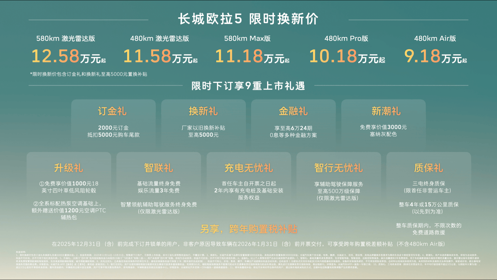 汽车欧拉品牌全新A级纯电SUV——长城欧拉5正式上市。新车共推出5款配置,建议零售价区间为 9.98万至13.38万元,限时换新价9.18万元起(限时换新价包含“订金礼”和“换新礼”至高5000元以旧换新补贴)。为回馈广大新老用户的热爱与支持,即日起至2025年12月31日,用户下订并锁单即可尊享包含订金礼、换新礼、智行无忧礼在内的9重上市好礼,以及跨年购置税补贴(不含480km Air版)等丰厚购车权益。凭借诚意十足的价格权益与越级产品力,长城欧拉5致力于成为全世界年轻用户的“严选搭子”。